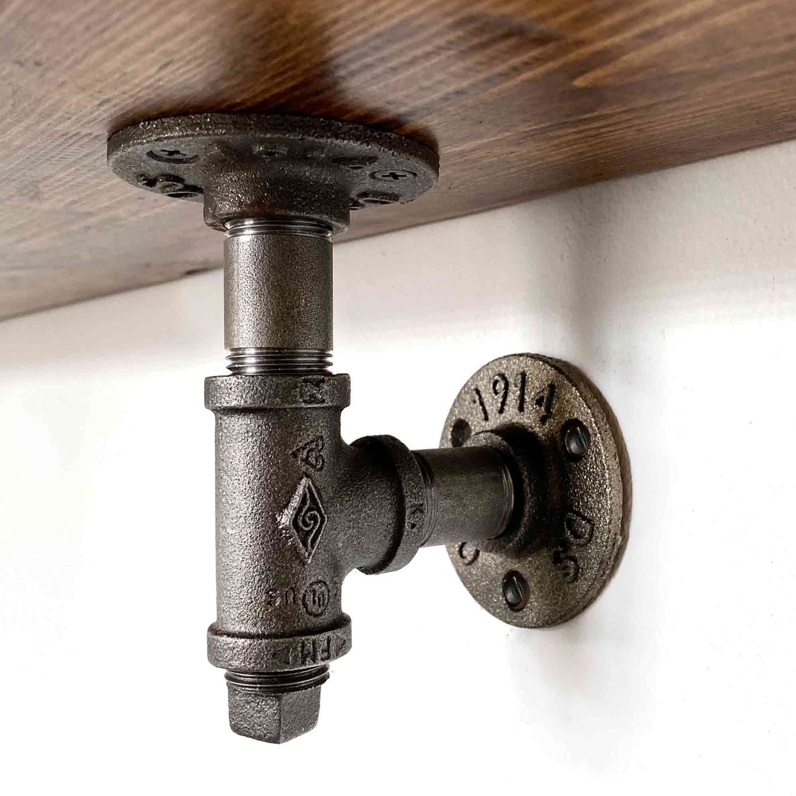 I add genuine cast iron pipe brackets to create a rustic industrial look